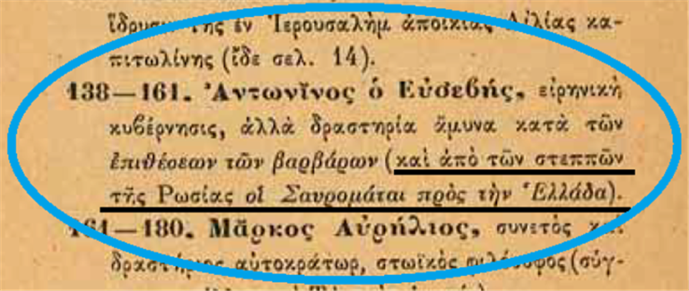 Ας δούμε τώρα τι έπραξαν οι Ρώσοι για την Ελλάδα. Η πρώτη επίθεση των Ρώσων εναντίον της Ελλάδος, που ως έτσι δεν θέλουν να την γνωρίζουμε, έγινε κατά την ΡωμαΪκή περίοδο, επί διοικήσεως του Αυτοκράτορος Αντωνίνου του Ευσεβούς (138 – 161 μ.Χ.), περίοδο κατά την οποία κινήθηκαν οι Σαυρομάτες εναντίον της Ελλάδος, αλλά δεν ξέρουμε τι έγινε μετά. Φυσικά ποτέ δεν διδάχθηκε η επίθεση των Σαυροματών στην χώρα μας γιατί δεν πρέπει να γνωρίζουμε τι είναι οι Σαυρομάτες, ποιά η σχέση τους με τον Ηρακλή, ούτε γιατί επιτέθηκαν στην Ελλάδα. Έτσι, στα καλά καθούμενα, αποφάσισαν μια μέρα να επιτεθούν στην Ελλάδα;
